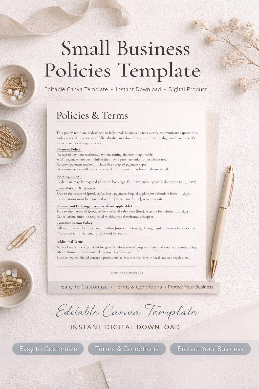 Perfect for service providers, online shops, creatives, and small business owners who want polished policies that are easy to customize and easy for clients to understand.